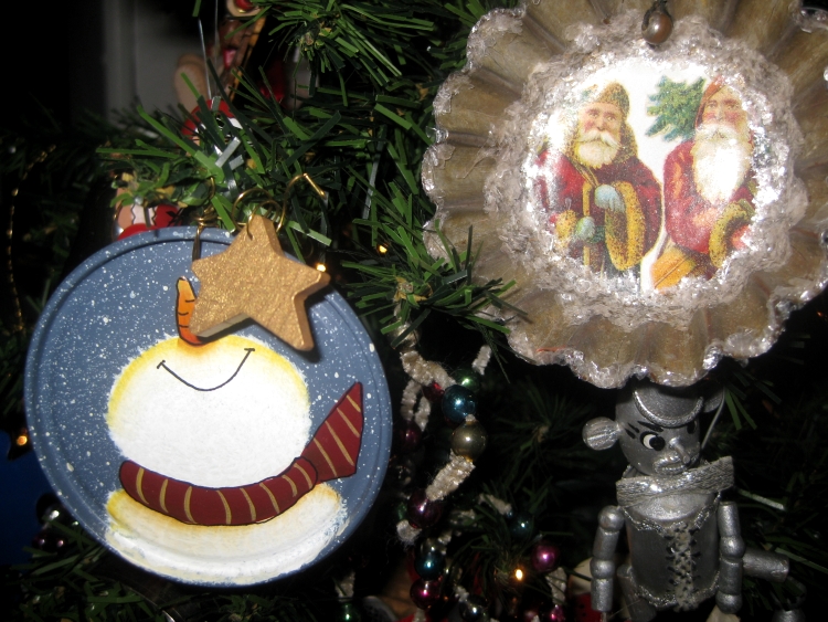 Ornaments I have made- the tart tin, and those made by friends- the juice tin lid with the happy snowman. The "tin man" is another childhood ornament.